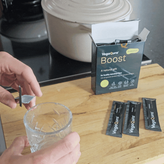 VegaQura Boost Probiotica ondersteunt een gezonde darmflora met acht probiotische stammen plus prebiotische vezels. Het helpt een soepele stoelgang te bevorderen en is ideaal voor dagelijks gebruik of na de VegaQura Base Detox.